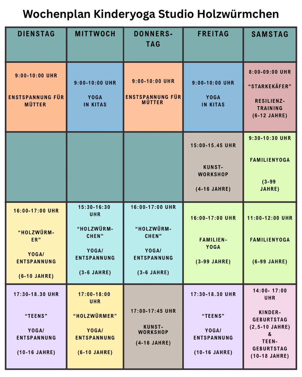 Der Holzwürmer-Kurs ist für Kinder von 3 bis 6 Jahren ohne Begleitung der Eltern. Die Schwerpunkte liegen besonders in der Bewegung, Yoga- und Entspannungsübungen.